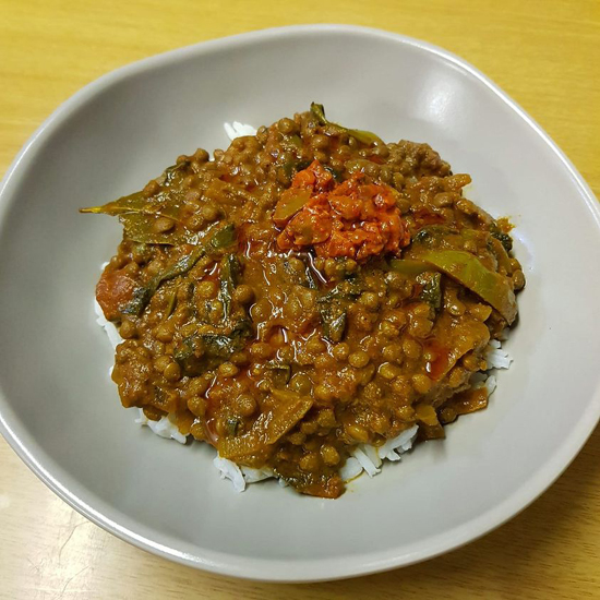 A super cosy, nourishing, fragrant and oh so good one pot budget friendly Meatfree LENTlL AND SPINACH CURRY served on a bed of white rice and a dollop of Homemade Atchar [????]